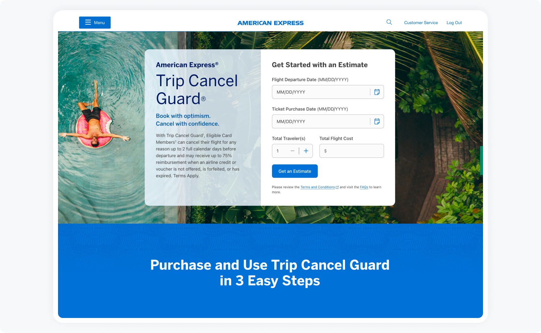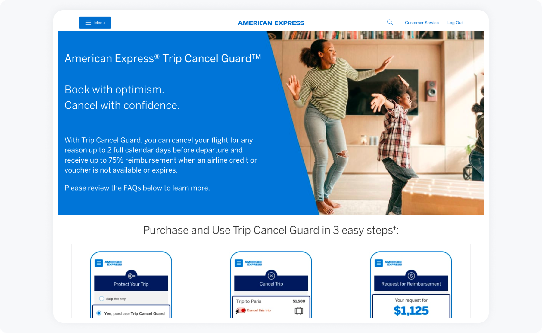 American Express Card Members often faced stress and uncertainty when trips were disrupted or cancelled. While protection benefits existed, the process to understand coverage, check eligibility, and purchase protection was confusing and fragmented. Trip Cancel Guard (TCG) was designed to fix this: it allows eligible American Express Card Members to cancel their flight for any reason up to 2 days before departure and receive up to 75% reimbursement when airline credits aren’t available. Customers didn’t just need more information—they needed confidence and clarity.